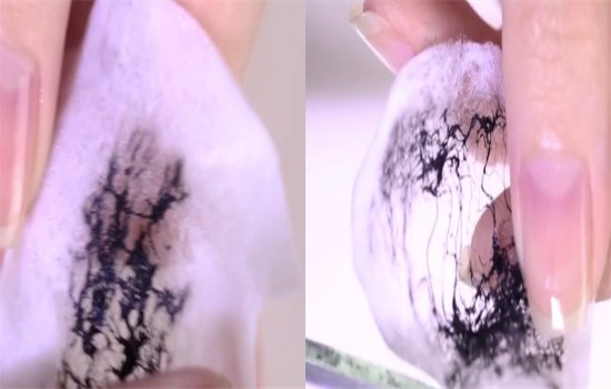 取出一片酒精棉,將黑色的甲油涂一點在酒精棉上。